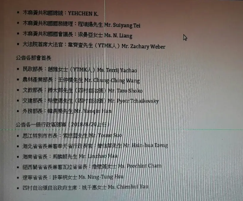 茲公布本國總統、總理、議長、首席大法官、部會首長、民選省級行政區長官。